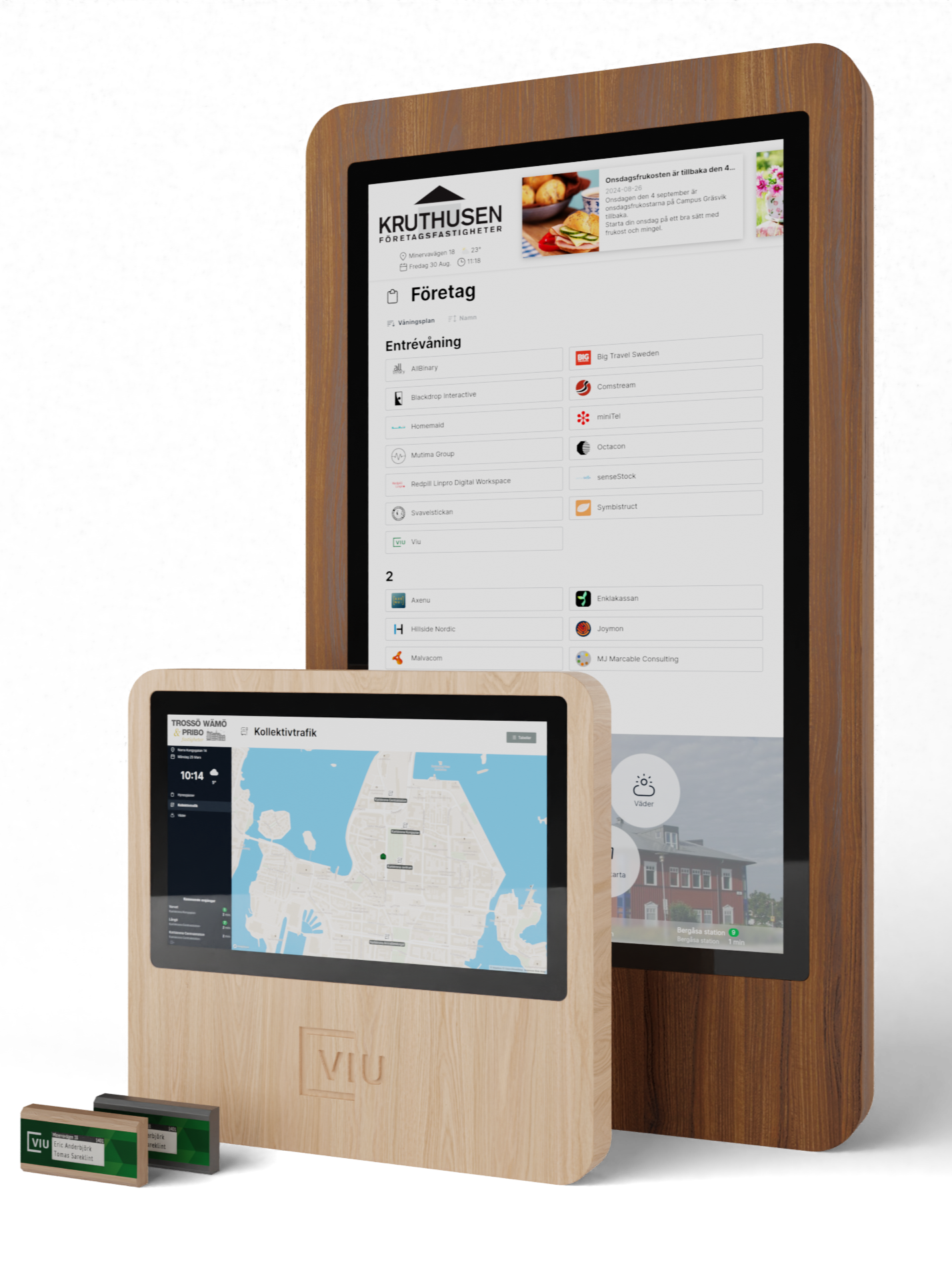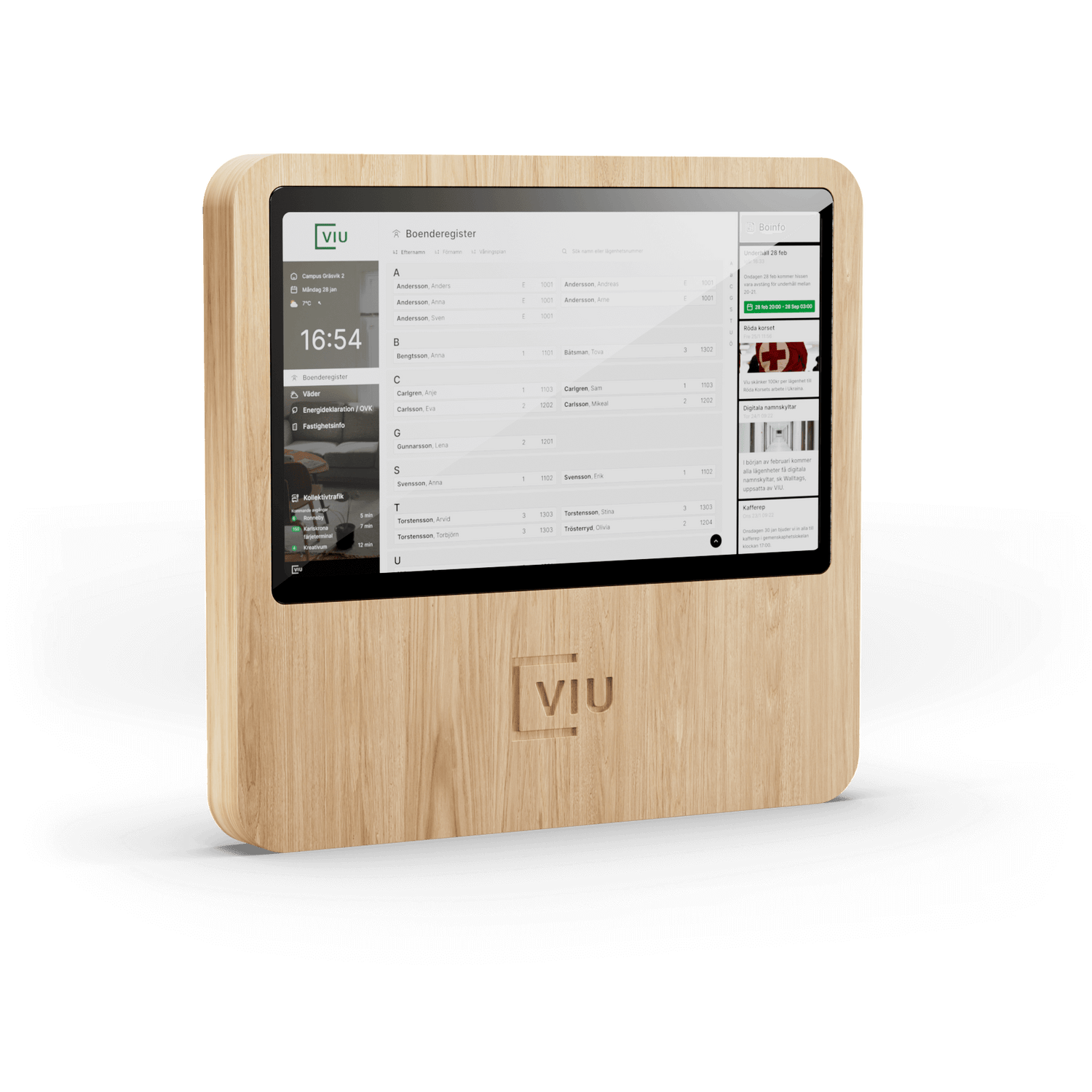 Förbättra hyresgästkommunikationen med Viu och ersätt de föråldrade, analoga anslagstavlorna. Vi introducerar WallPad – en modern, snygg, interaktiv skärm som förbättrar kommunikationen mellan fastighetsägare, boende och besökare. Med WallPad blir all viktig information, från boenderegister, meddelanden om underhåll och dokumentation till kollektivtrafiksavgångar, tillgänglig på en enda plats.